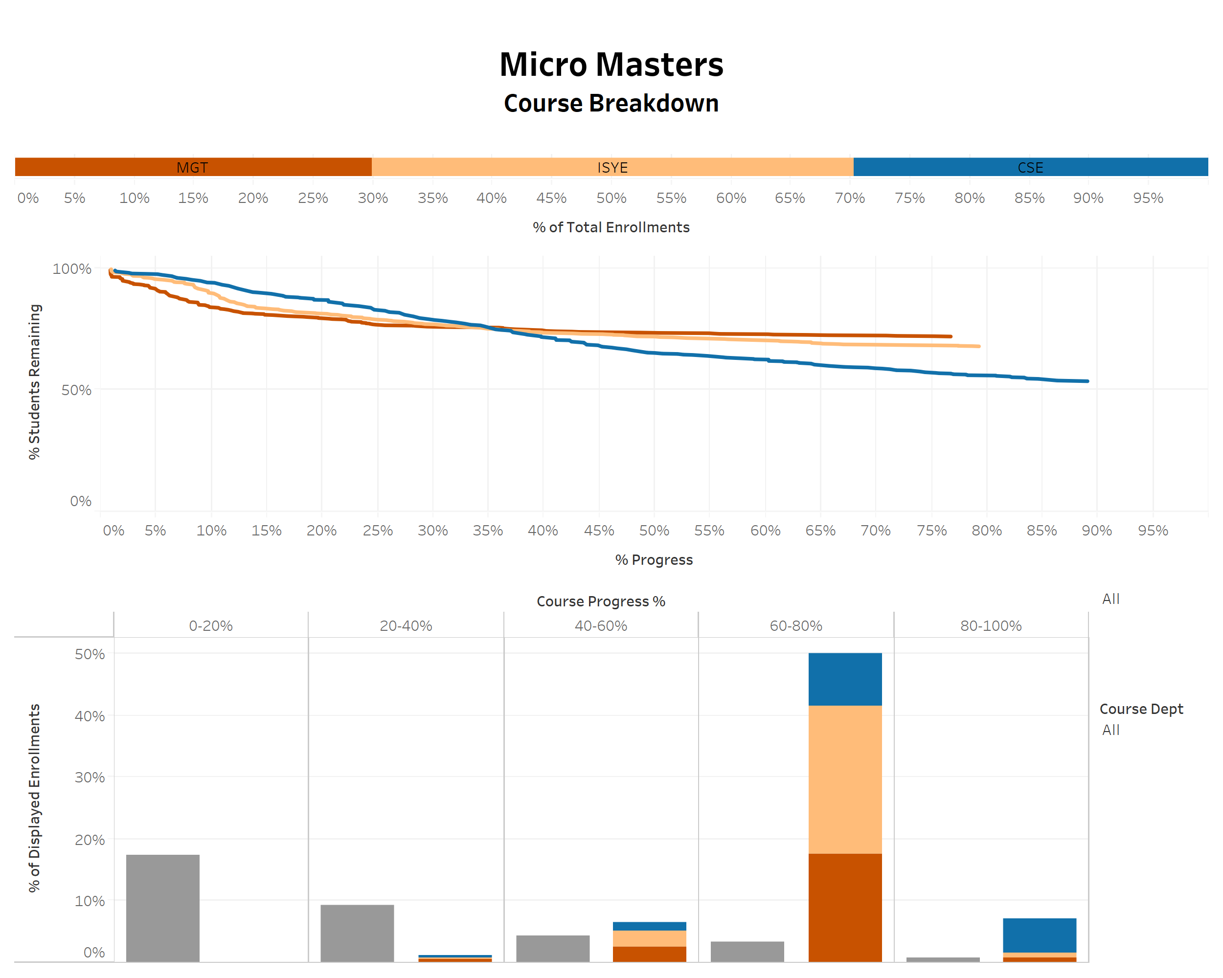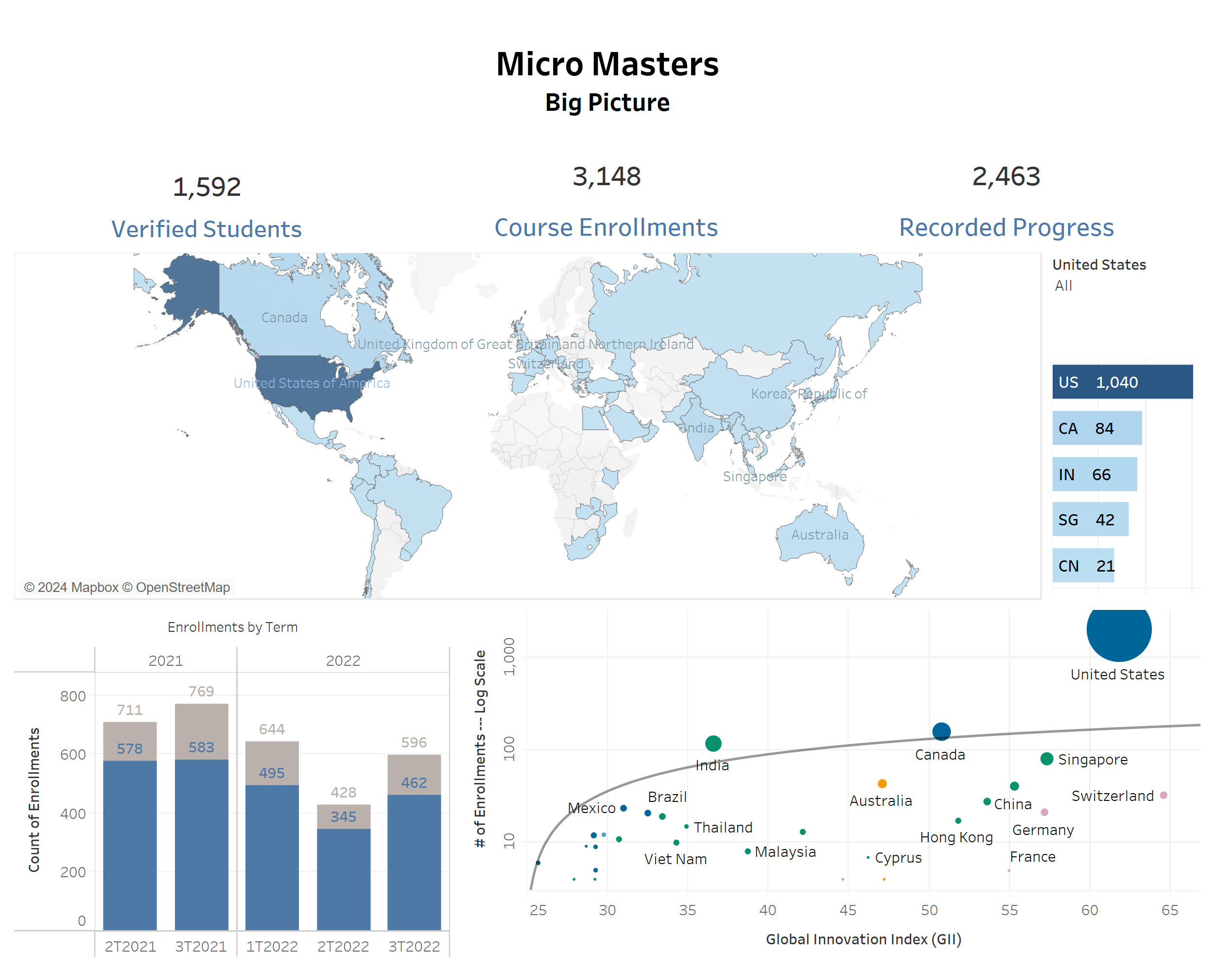 Additionally, the team examined large data sets generated from the program to visually profile students' demographics and actions from enrollment to course completion to provide insights into students' persistence, progress, and success patterns. This study provides illustrative examples of data-driven practices to understand the needs of mid-career professionals and lifelong learners. It also informs areas of opportunities to support student engagement and success in an online micro-credential program environment. The team shared their findings at the 2023 OLC Innovate and Affordable Degrees at Scale conferences.